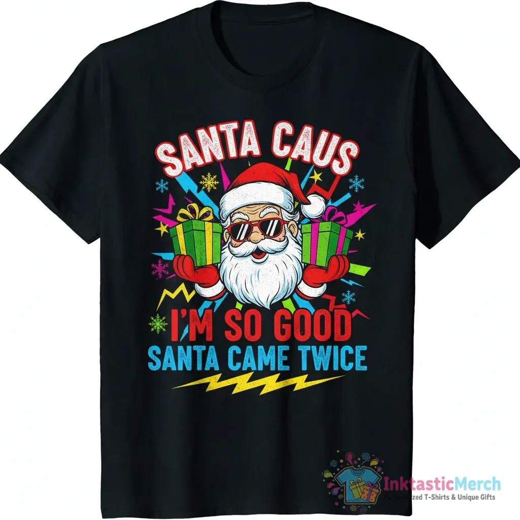 - Unique “Santa Claus I’m So Good Santa Came Twice” cartoon graphic.