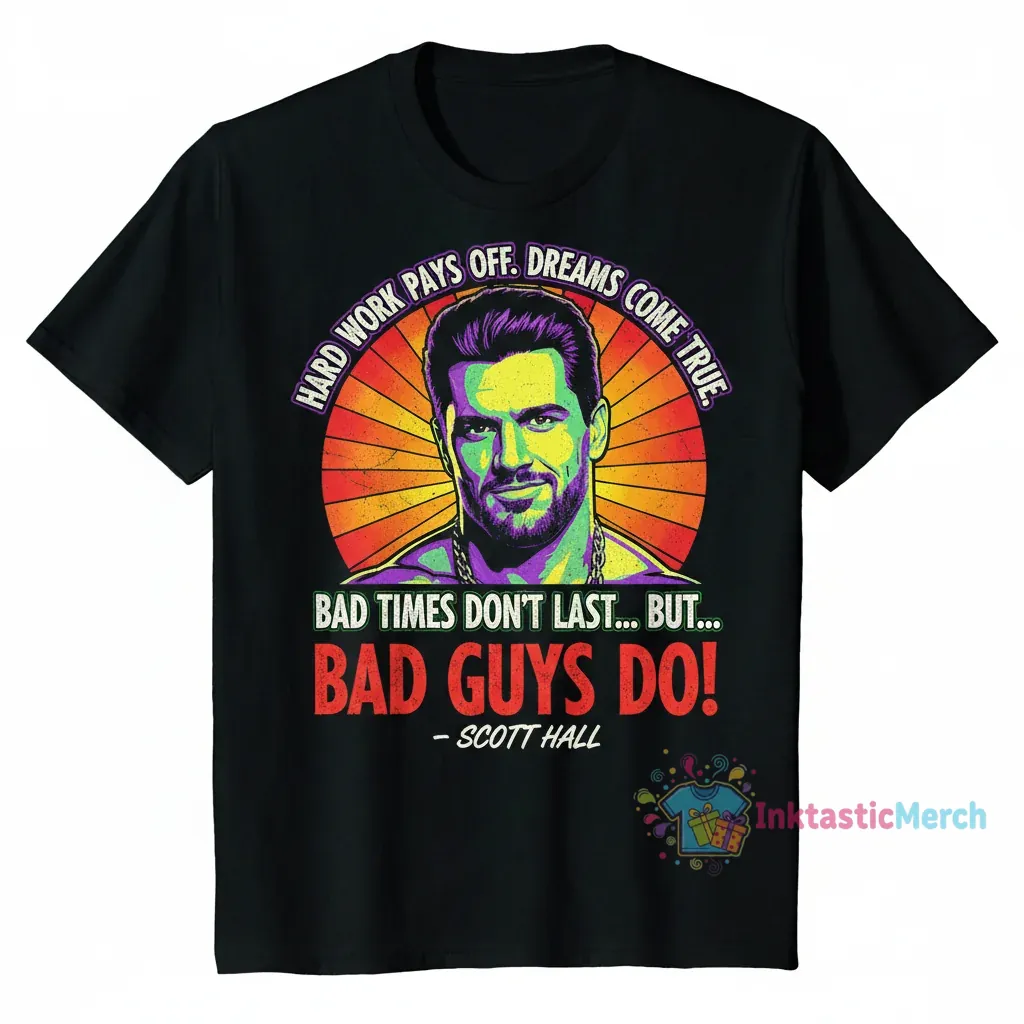 Hard work pays off, and with this tee, you wear a powerful reminder of that truth. Inspired by the unforgettable words and indomitable spirit of Scott Hall, this shirt is more than just apparel – it’s a statement. “Bad times don’t last, but bad guys do” is a motto that resonates with resilience, determination, and the enduring impact of those who dare to be different. It speaks to overcoming challenges and leaving a lasting impression, mirroring the legacy of a true icon.