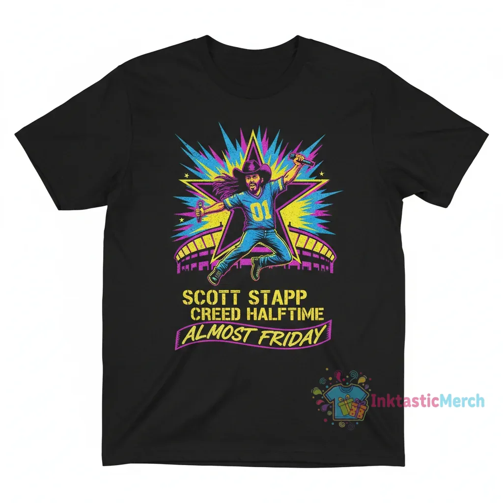 This Scott Stapp Creed 2001 Dallas Cowboys Half-Time Show Almost Friday t-shirt is a must-have for fans of the iconic band and unforgettable performances. Celebrate a legendary moment in music and sports history with this unique graphic tee. Perfect for concerts, casual wear, or as a collectible, this shirt captures the spirit of the early 2000s and the powerhouse presence of Scott Stapp and Creed at the Dallas Cowboys’ iconic half-time show.