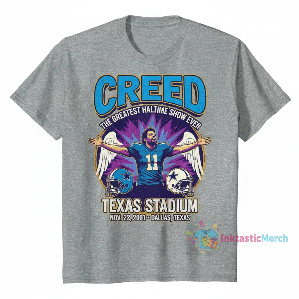 Celebrate the iconic “Greatest Halftime Show Ever” with this exclusive Scott Stapp Creed Texas Stadium T-Shirt, crafted from 100% ring-spun cotton for premium comfort and durability. This high-quality tee features a modern retail fit and superior construction, ensuring it remains a cherished piece in your collection for years to come. Discover more fan apparel at inktasticmerch.com.