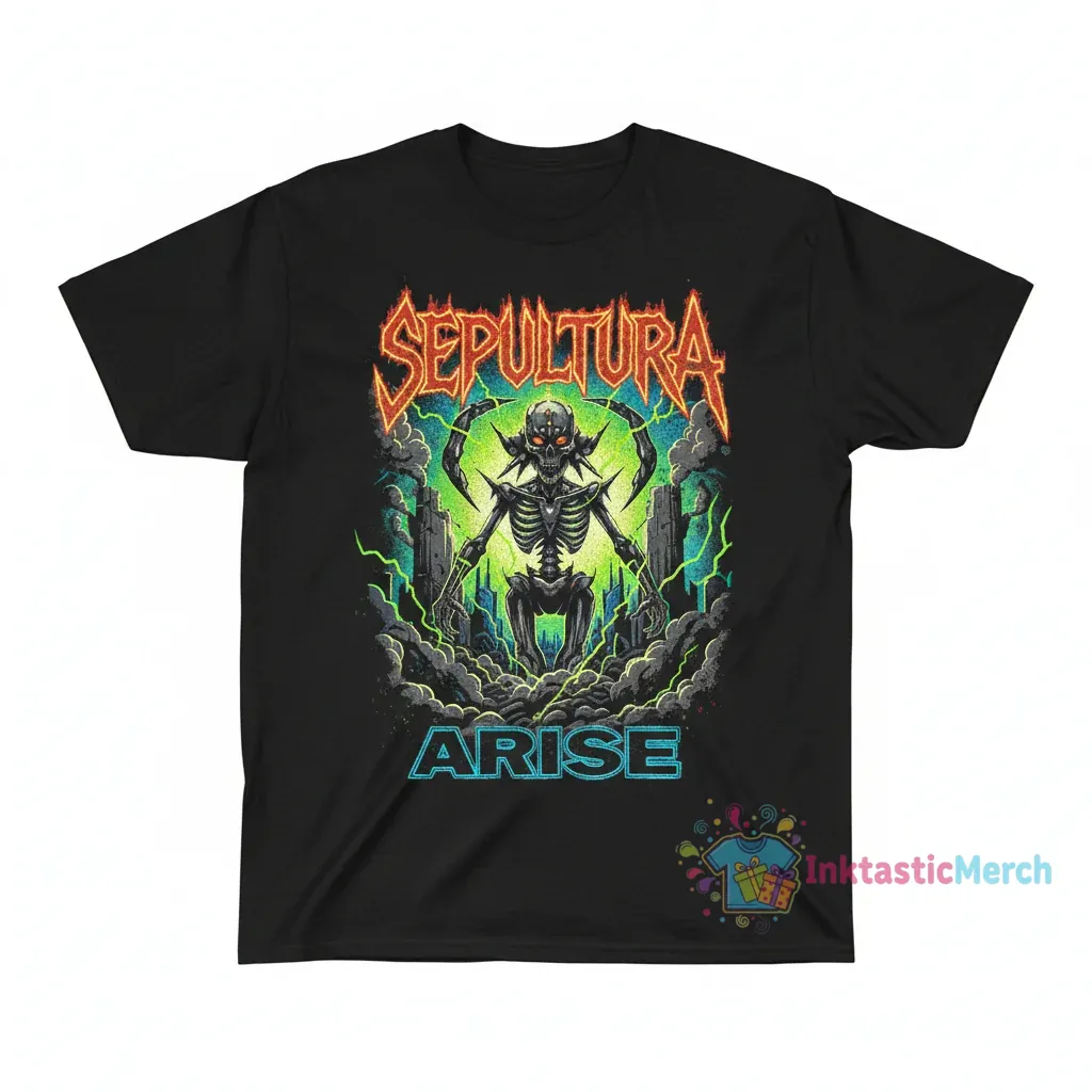 To preserve the vibrant print and soft texture of your Sepultura Arise t-shirt, we recommend machine washing it cold, inside-out, with like colors. Tumble dry on low heat or hang dry for best results. Avoid ironing directly on the graphic. This versatile tee pairs effortlessly with jeans, shorts, or layered under a jacket, making it ideal for casual outings, music festivals, or simply relaxing at home. It’s the perfect addition to any metalhead’s wardrobe, celebrating a legendary album and band.
