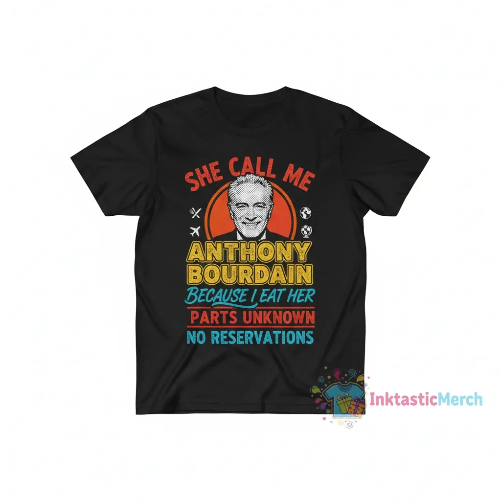 This ‘She Calls Me Anthony Bourdain Because I Eat Her Parts Unknown No Reservations’ t-shirt is a tribute to the iconic chef and adventurer, perfect for foodies, travelers, and fans of culinary exploration. Inspired by Anthony Bourdain’s philosophy of experiencing the world through its food, this shirt makes a bold statement about embracing new flavors and cultures. It’s an ideal gift for anyone who shares a passion for authentic cuisine and fearless exploration, embodying the spirit of discovery with every wear. Get ready to spark conversations and share your love for adventure.