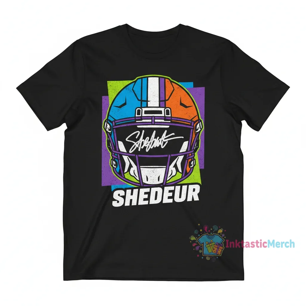 To preserve the quality and vibrant print of your Shedeur Sanders Big Face Helmet Signature T-Shirt, we recommend machine washing cold, inside-out, with like colors. Use only non-chlorine bleach when needed, and tumble dry low. For best results and to maintain the fabric’s integrity, iron on a low setting if necessary, avoiding the printed area. This versatile t-shirt is perfect for various occasions. Wear it to support your favorite team on game day, to casual outings with friends, or as part of your everyday streetwear. It also makes an excellent gift for any Shedeur Sanders fan, collector, or football enthusiast looking for high-quality, stylish fan apparel.