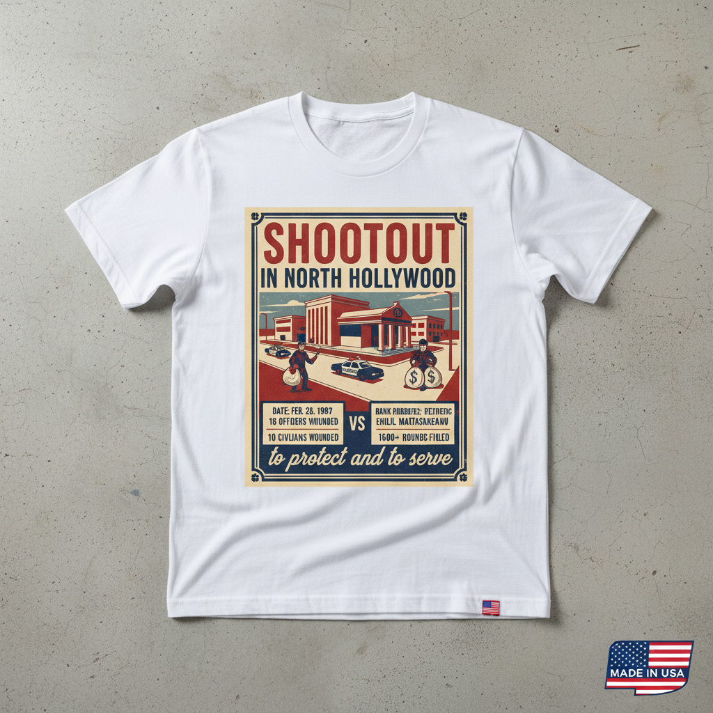 - Unique “Shootout In North Hollywood To Protect And To Serve” graphic print