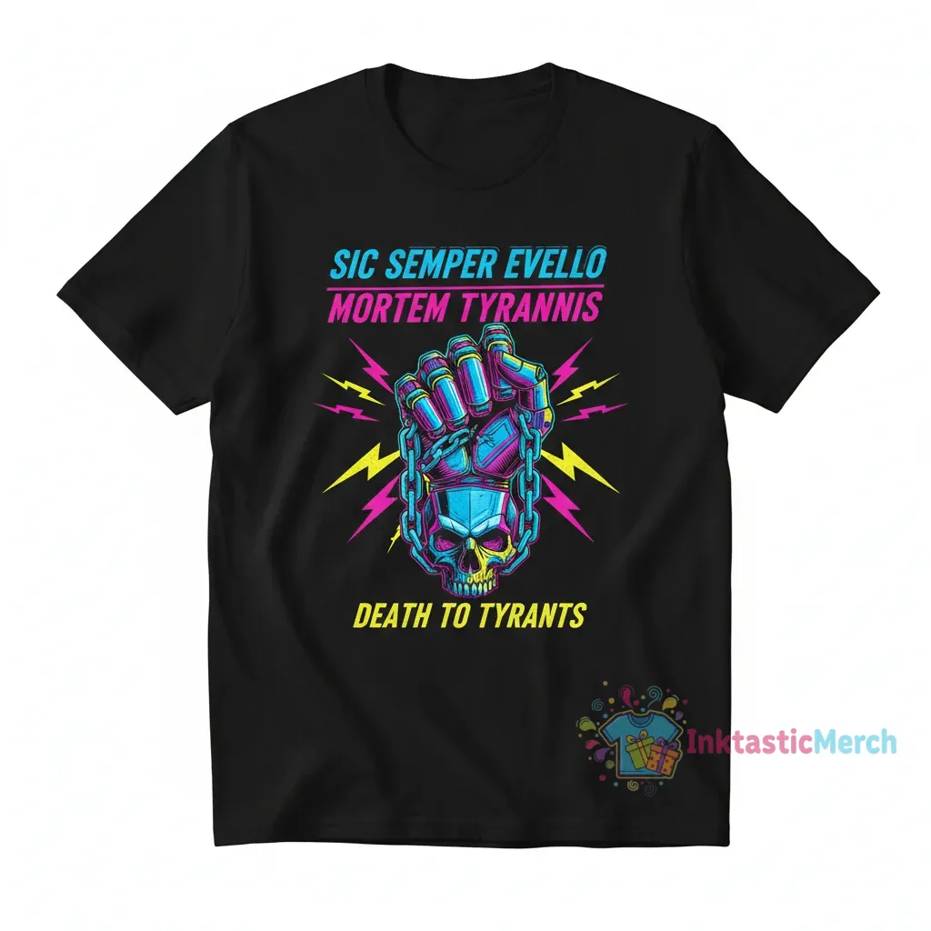 This design boldly emblazons the Latin phrase “Sic Semper Evello Mortem Tyrannis,” famously associated with defiance and liberation. The artwork is rendered in a classic, commanding style, evoking a sense of historical gravitas and unwavering resolve. It’s more than just text; it’s a visual echo of courage, designed to resonate with those who appreciate historical significance and the power of words. Imagine the stark, impactful typography conveying a message that has echoed through centuries, sparking thought and conversation wherever you go. This T-shirt is a wearable piece of history, a symbol of strength for the modern era.