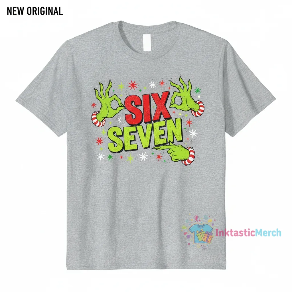 Introducing the Six Seven Christmas Grinch Hand Shirt, the perfect festive apparel for celebrating the holiday season with a touch of iconic mischief. This uniquely designed t-shirt captures the spirit of Christmas with a playful Grinch hand graphic, making it an ideal choice for holiday parties, casual wear, or as a memorable gift for fans of the beloved character. Embrace the Christmas cheer with this comfortable and stylish addition to your seasonal wardrobe.