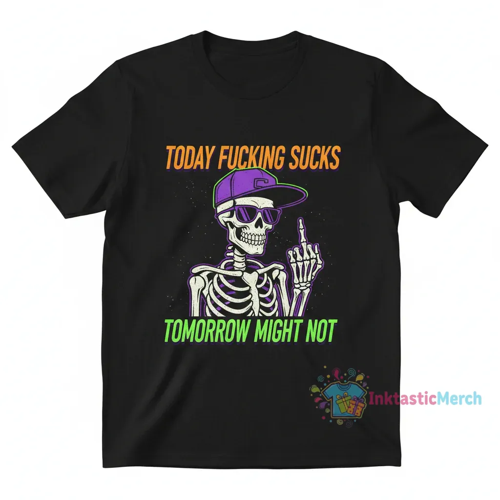 Embrace your feelings with the Skeleton Today Fucking Sucks, Tomorrow Might Not T-Shirt from InktasticMerch. This unique tee features a striking skeleton graphic, perfect for those rough days, and is designed for comfort and honesty, making it a relatable statement piece that lets you wear your mood and optimism. Crafted for those who appreciate dark humor and a lot of honesty, this shirt is built to be a conversation starter and a mood booster.