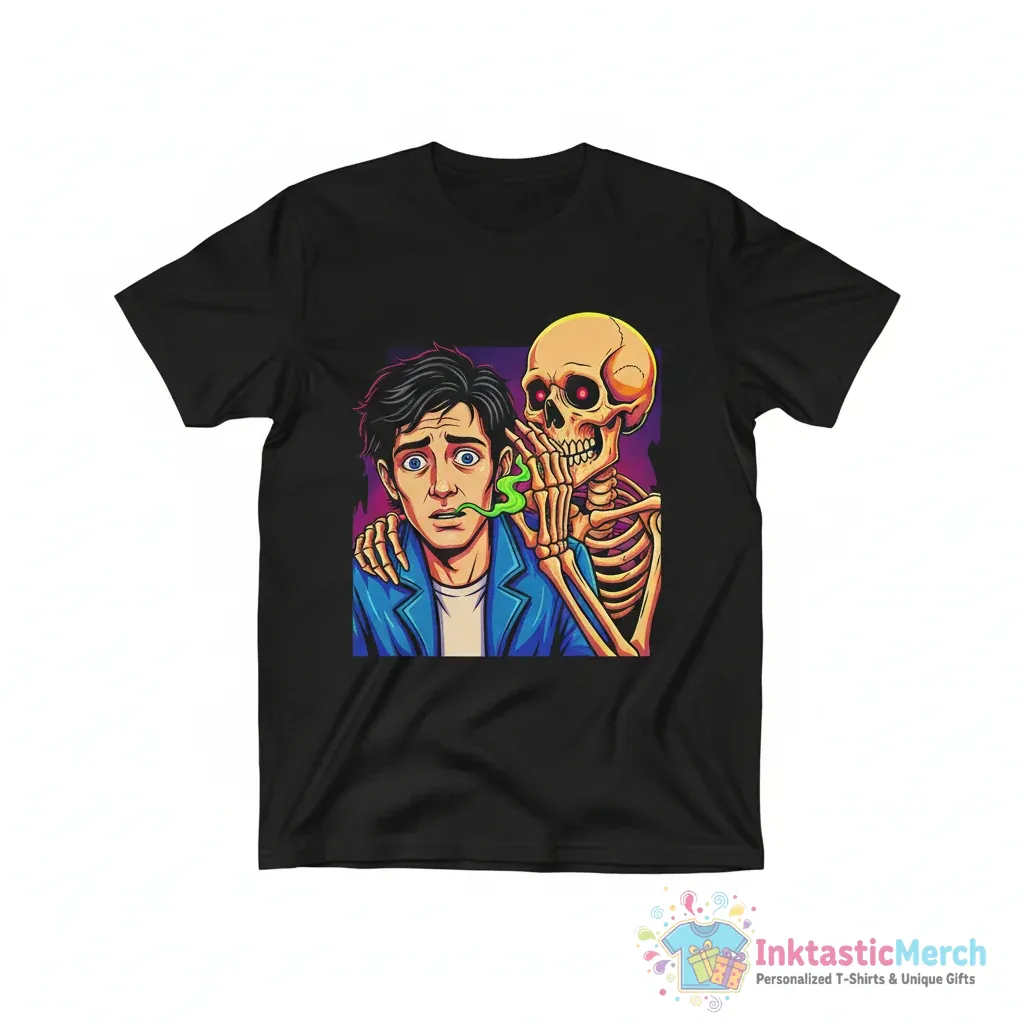 Unleash your unique style with the Skeleton Whispering In Man’s Ear T-Shirt from InktasticMerch. Crafted for ultimate comfort and durability from ultra-soft, premium quality fabric, this tee features a striking and intriguing graphic perfect for those who appreciate bold, artistic, and slightly mysterious aesthetics. Its durable construction and flattering unisex fit make it a staple in your wardrobe for years to come.