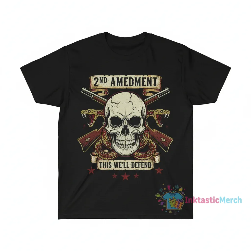 Bring your style to life with the Skull 2nd Amendment Tattoo “This We’ll Defend” T-Shirt today!