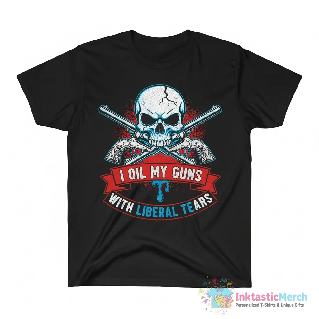 Bring your style to life with the Skull and Guns I Oil My Guns with Liberal Tears Shirt today!