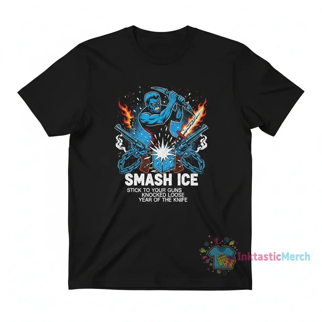Bring your style to life with the Smash Ice stick to your guns knocked loose year of the knife shirt today!