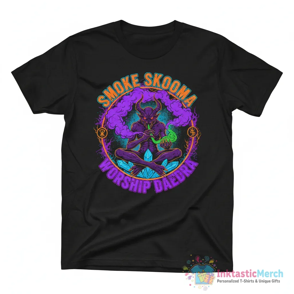 - Eye-catching “Smoke Skooma Worship Daedra” graphic design.