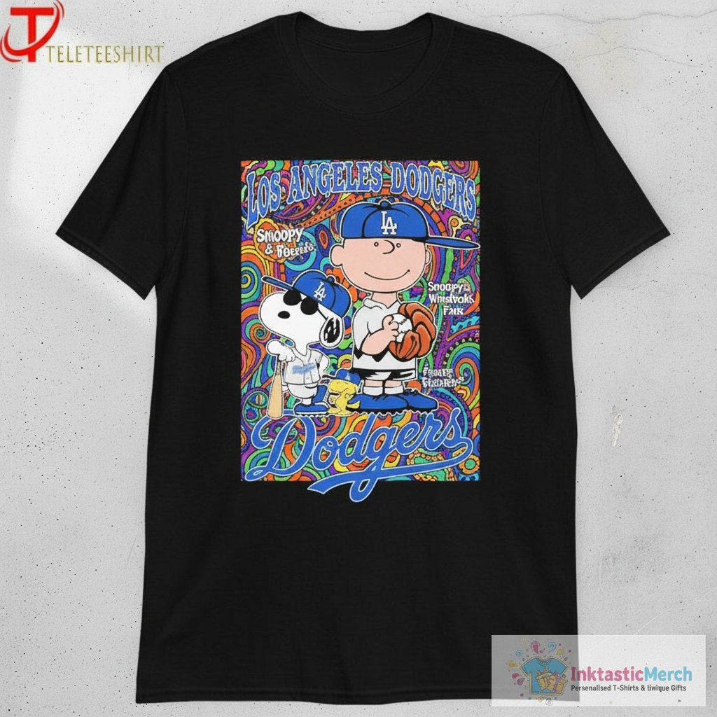 Baseball fans, Peanuts enthusiasts, collectors of unique fan apparel, casual everyday wear, attending Dodgers games, gifting to friends and family, or simply adding a touch of playful nostalgia to your wardrobe. This shirt is ideal for anyone who appreciates iconic characters and the excitement of the game.