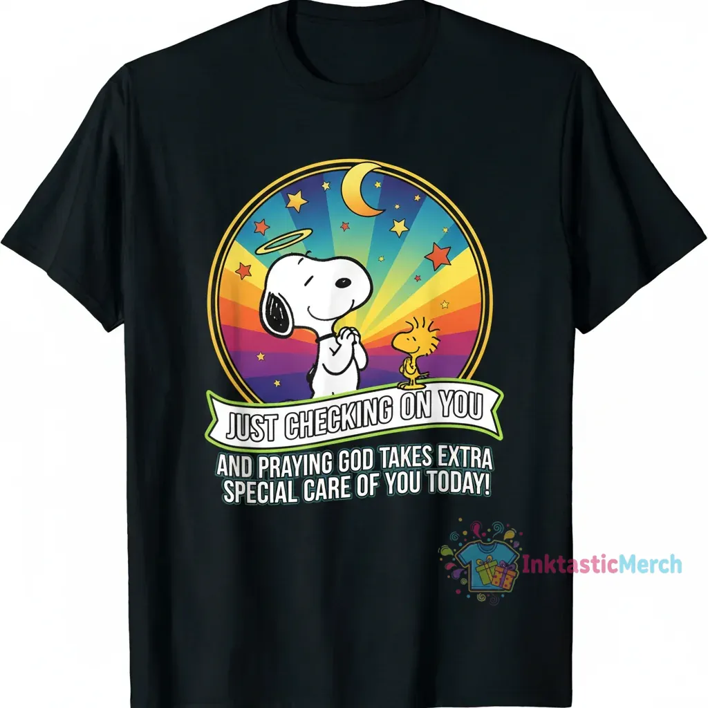 This Snoopy “Checking On You & Praying God Takes Extra Special Care of You Today” t-shirt is a heartwarming and comforting piece of apparel designed for fans of the beloved Peanuts character. It features a touching graphic of Snoopy, embodying a message of care and well-wishes. This shirt is perfect for expressing thoughtful sentiments to friends and loved ones, offering a gentle reminder that someone is thinking of them and hoping for their well-being. Its unique design makes it a standout item for casual wear, gift-giving, or as a personal reminder of faith and friendship.