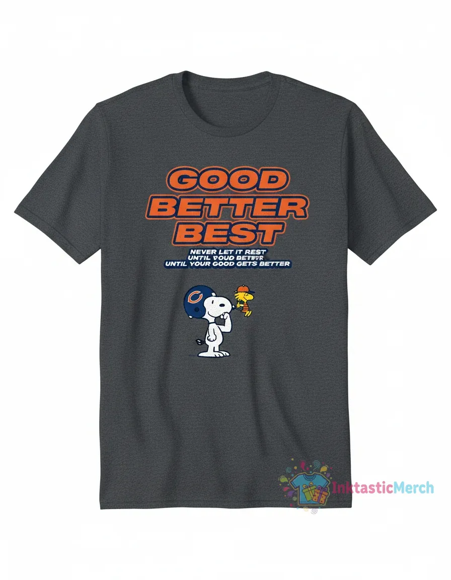 Show your unwavering support for the Chicago Bears and embrace the relentless pursuit of greatness with the Snoopy Chicago Bears: Good, Better, Best – Never Rest Until Your Best is Better Shirt from InktasticMerch. This tee is meticulously crafted from a premium, soft-touch cotton blend with pre-shrunk treatment for lasting fit and features vibrant, eco-friendly inks that resist fading and cracking, ensuring exceptional comfort and style for all-day wear.