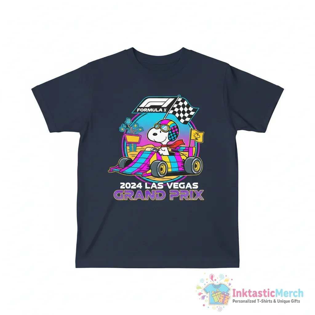 Rev up your style with the Snoopy Formula 1 x Peanuts Youth 2024 Las Vegas Grand Prix shirt! Crafted from super-soft, breathable cotton for maximum comfort and featuring a durable, vibrant print, this tee is built to last. Discover more premium fan apparel at inktasticmerch.com.