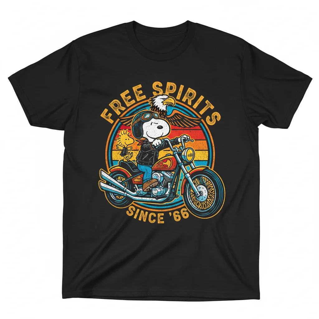 - Iconic Artwork: Features a vibrant and detailed graphic of Snoopy and Woodstock on a Harley-Davidson motorcycle, combining two beloved American icons into one fantastic design.