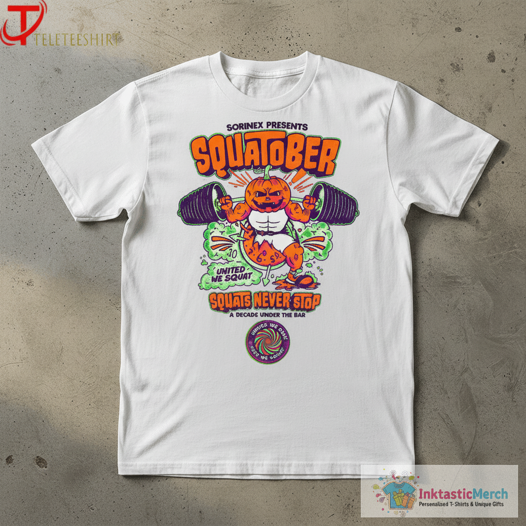 Celebrate a decade of dedication to the squat with the Sorinex Presents Squatober t-shirt. Crafted from a high-quality, super-soft cotton blend, this tee offers ultimate comfort for both intense gym sessions and casual wear. Showcase your commitment to the iron and the lifting community with this durable, uniquely designed shirt, available through InktasticMerch.