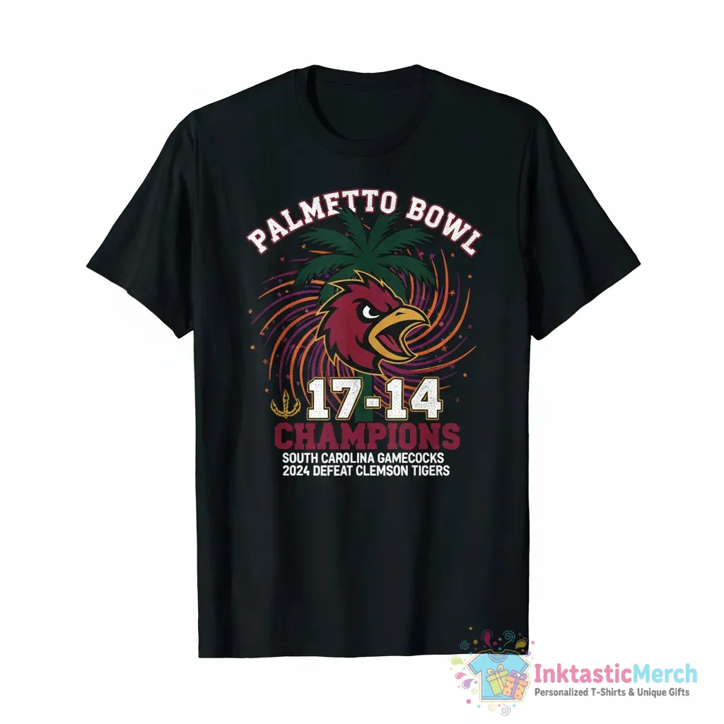 Celebrate the epic South Carolina Gamecocks victory in the 2024 Palmetto Bowl! This exclusive championship t-shirt commemorates the Gamecocks’ hard-fought 17-14 win over the Clemson Tigers. Show your pride and relive the thrilling moments of this historic game with this officially inspired fan gear. It’s the perfect way to honor your team’s incredible achievement and showcase your Gamecocks spirit all year round.