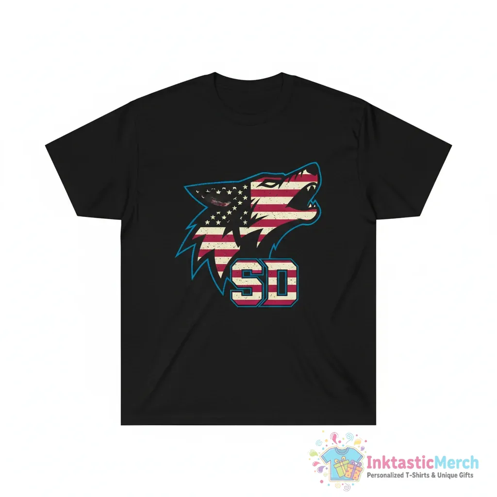 Show your South Dakota pride with this unique South Dakota Coyotes logo USA flag shirt from InktasticMerch. This premium quality tee combines bold team spirit with patriotic flair, crafted from super soft, high-quality fabric for incredible comfort and style.