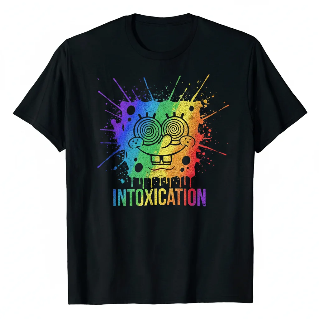 - Iconic Graphic: Unique “Spongebob Intoxication Rainbow Meme” print for a standout look.