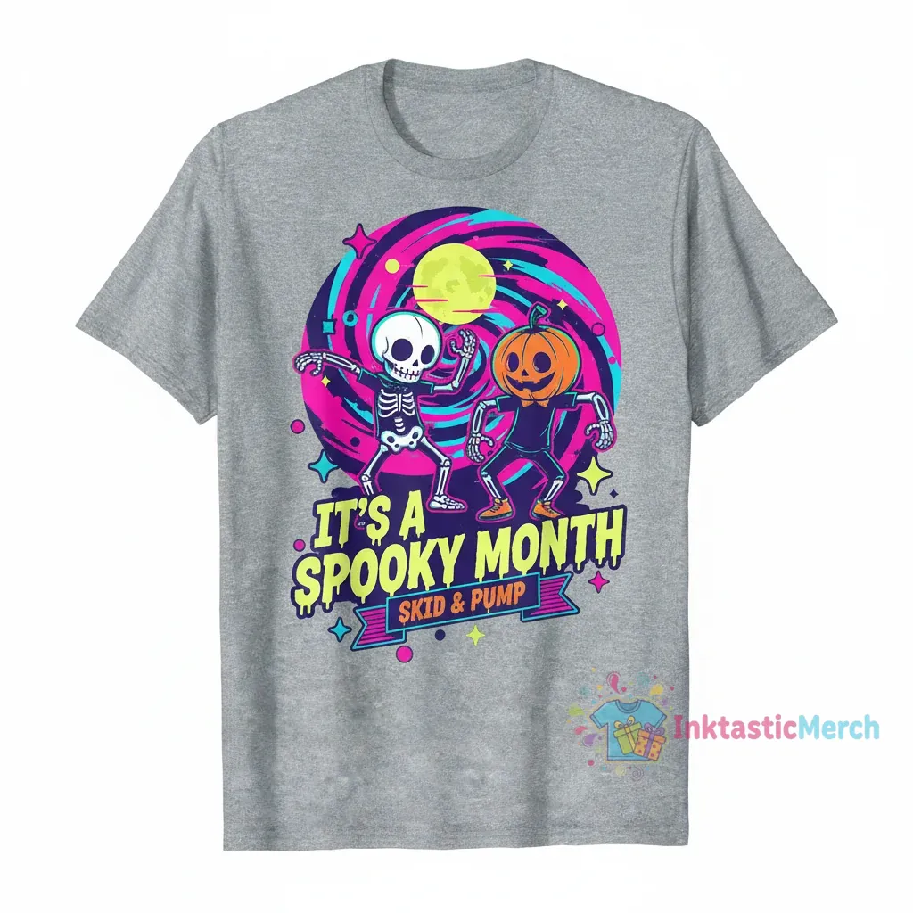 This Spooky Month tee is destined to become a staple in your wardrobe. Its unique design and exceptional comfort make it a standout piece that adds personality to any outfit. Pair it with your favorite jeans for a casual look, layer it under a jacket for cooler evenings, or simply wear it as a statement of your love for all things wonderfully weird. Embrace the spirit of Skid and Pump and let this tee inject a dose of fun and artistic flair into your daily life.