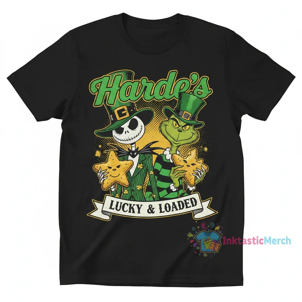 Celebrate St. Patrick’s Day with a touch of spooky fun! Our St. Patrick’s Day Jack Skellington & Grinch Hardee’s Shirt brings together two iconic characters in a festive Irish-themed design. Perfect for fans of Halloween and St. Paddy’s Day alike, this unique t-shirt is sure to turn heads and spark conversations. Get ready to show off your quirky style this holiday season with this must-have tee.