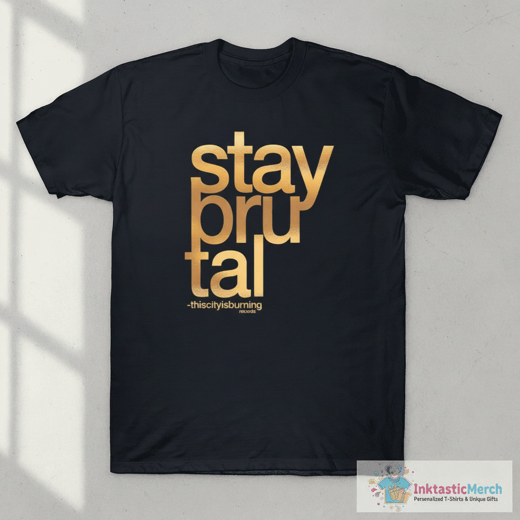 Show off your edgy style with the Stay Brutal Foil Thiscitysburning T-shirt, a statement piece designed with striking foil details and crafted from premium, ultra-soft fabric for ultimate comfort. This unique tee, available at inktasticmerch.com, offers a luxurious feel and a bold graphic that ensures you stand out from the crowd.