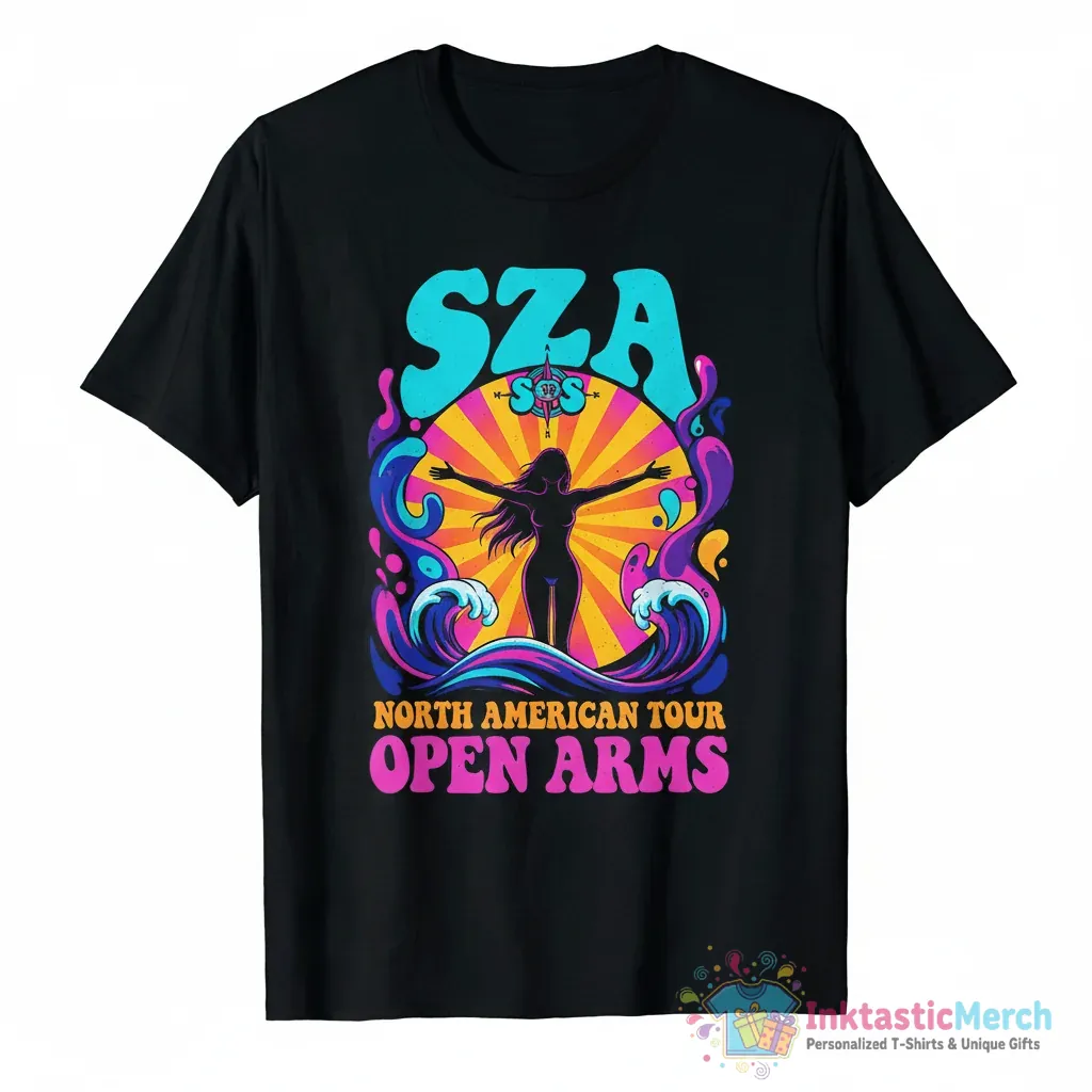 Show your love for SZA’s iconic SOS Tour with this eye-catching open arms t-shirt from InktasticMerch. Crafted from premium, ultra-soft cotton, this shirt offers incredible comfort and a unique design inspired by the tour’s themes, making it a must-have for any dedicated fan.