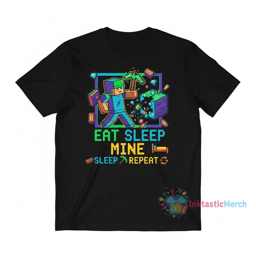 Showcase your passion for Minecraft with this ultra-soft ‘Eat Sleep Mine Repeat’ T-shirt, crafted from premium, breathable fabric for exceptional comfort during long gaming sessions. The vibrant, lasting print ensures your gaming statement stays bold wash after wash, reflecting the high-quality assurance you can expect from <a href="inktasticmerch.com“>inktasticmerch.com.