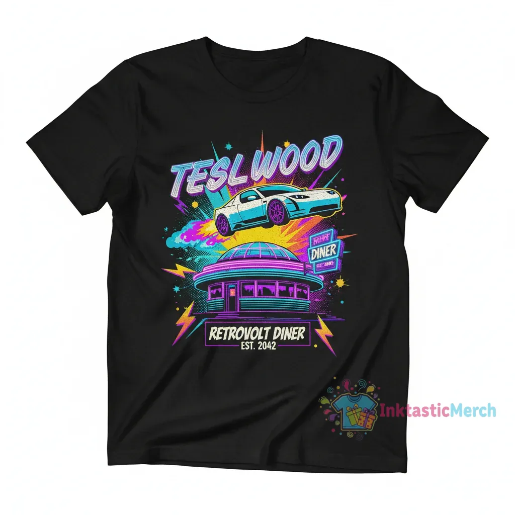 Discover the iconic Tesla Hollywood Retro Diner T-Shirt, a perfect blend of vintage charm and modern comfort, designed for fans of classic aesthetics and automotive history.