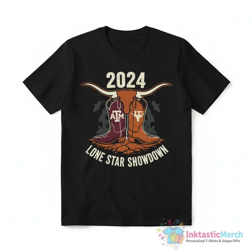 Bring your style to life with the Texas A&M Aggies vs. Texas Longhorns 2024 Lone Star Showdown Boot shirt today!