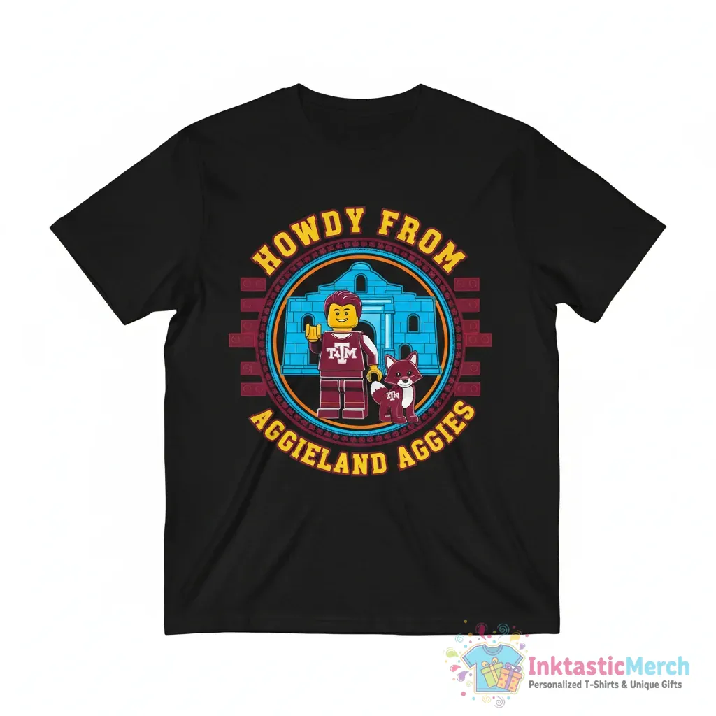 Show your Aggie pride with the Texas AM University Howdy From Aggieland Alamo Aggies Lego shirt, crafted from ultra-soft, premium fabric for all-day comfort. This tee features a unique, durable design that won’t fade, making it perfect for current students, alumni, and fans to represent their university in style. Discover more quality apparel at inktasticmerch.com.