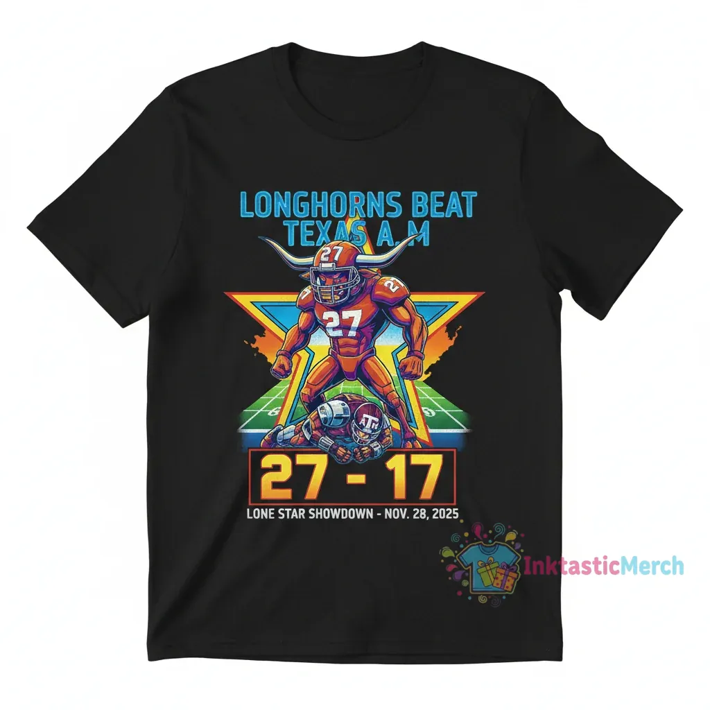 Celebrate a legendary victory with the Texas Longhorns beat Texas A&M 27-17 Lone Star Showdown mascot shirt! This tee is the perfect way to showcase your Longhorns pride after their dominant performance against their biggest rivals. Feel the excitement of that unforgettable game every time you wear it. It’s more than just a shirt; it’s a statement of loyalty and a reminder of a true triumph in the Lone Star Showdown.