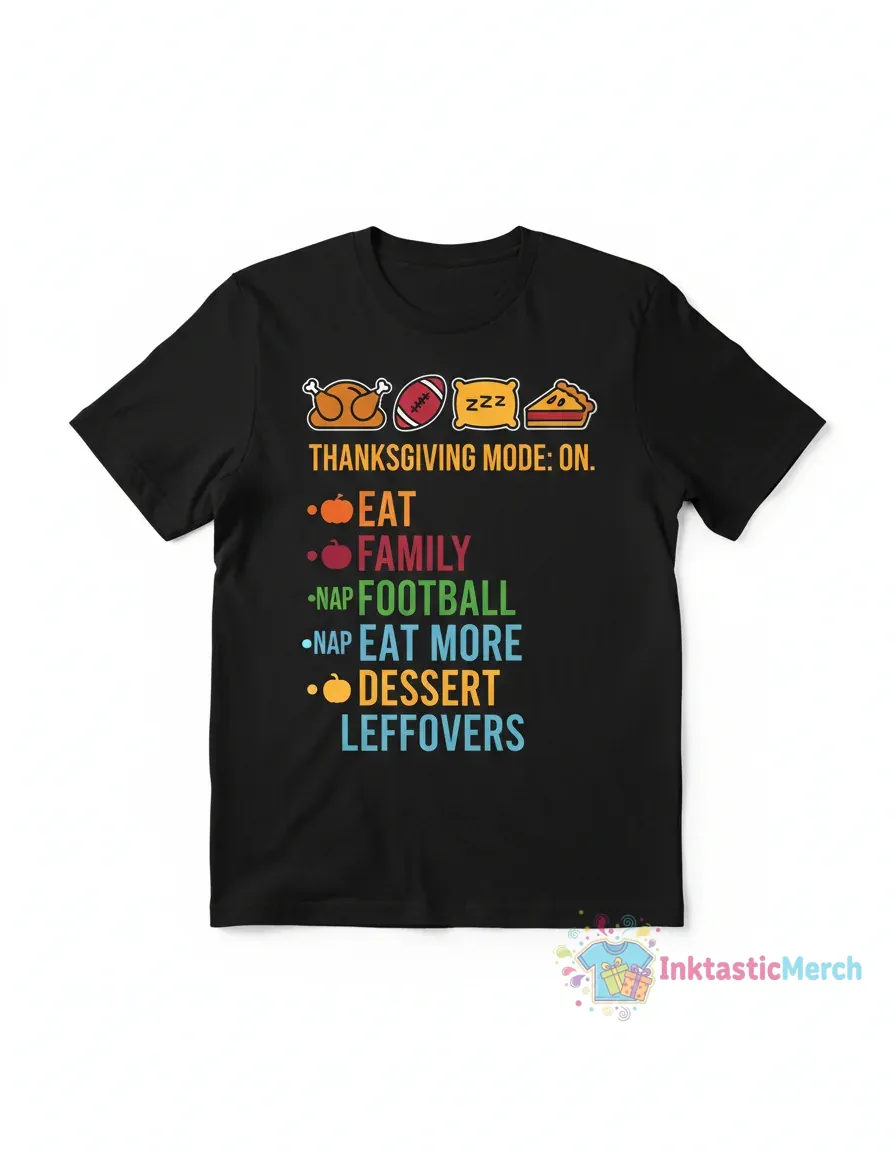 Embrace the ultimate Thanksgiving mood with this tee from InktasticMerch, crafted from premium, ultra-soft fabric for unmatched softness and feel. Designed for effortless comfort and elevated style, this shirt captures the essence of relaxed vibes and is perfect for lounging, cheering, or indulging in the delicious cycle of dessert and leftovers.