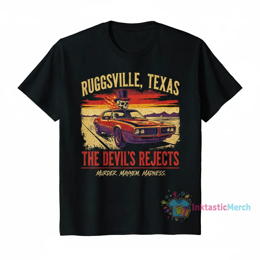 Showcase your love for the cult classic film with this officially inspired The Devil’s Rejects Ruggsville Texas T-Shirt from InktasticMerch. Crafted from 100% ring-spun cotton for exceptional softness and durability, this tee features a striking, high-quality printed design that’s built to last wash after wash.