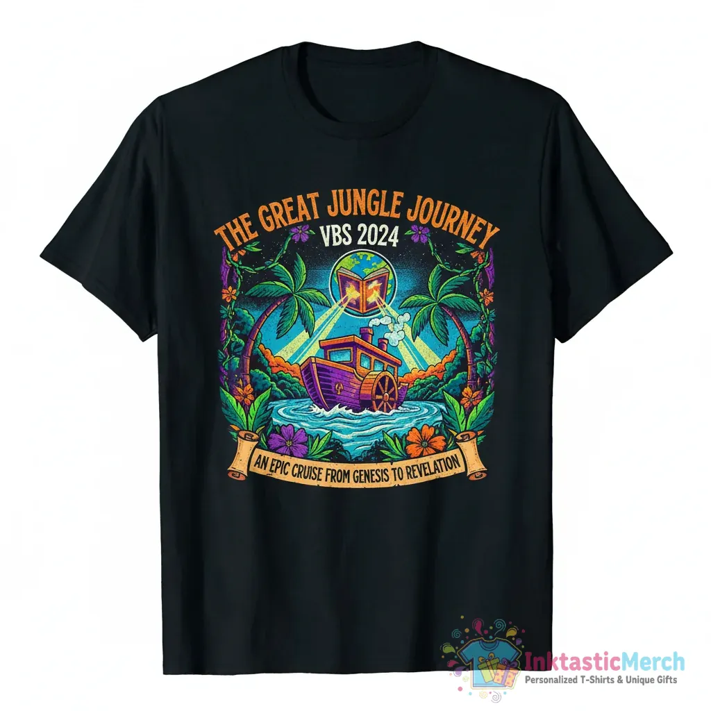 Embark on an epic adventure with the Great Jungle Journey VBS 2024 cruise shirt! Crafted from ultra-soft, premium quality fabric, this tee ensures maximum comfort and durability for years of wear. Express your faith and spirit of adventure with this vibrant, universally flattering unisex design, perfect for VBS 2024 events and everyday wear. Discover more faith-based apparel at inktasticmerch.com.