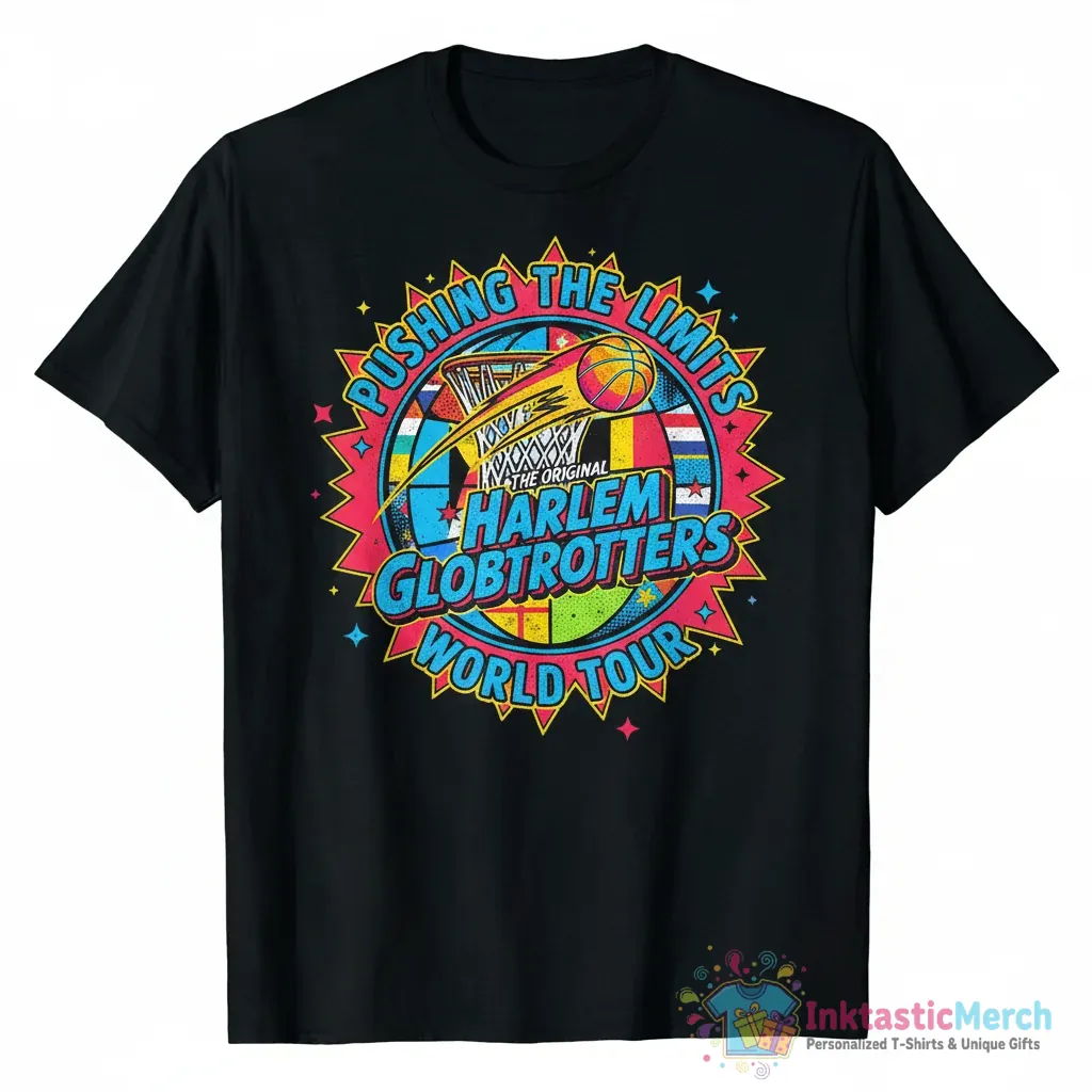 Showcase your love for the legendary Original Harlem Globetrotters with this exclusive Pushing the Limits World Tour logo shirt from InktasticMerch. Crafted from super-soft, high-quality fabric, this tee offers the perfect blend of iconic style and everyday comfort, making it a fantastic way to represent the Globetrotters’ spirit of innovation and fun.