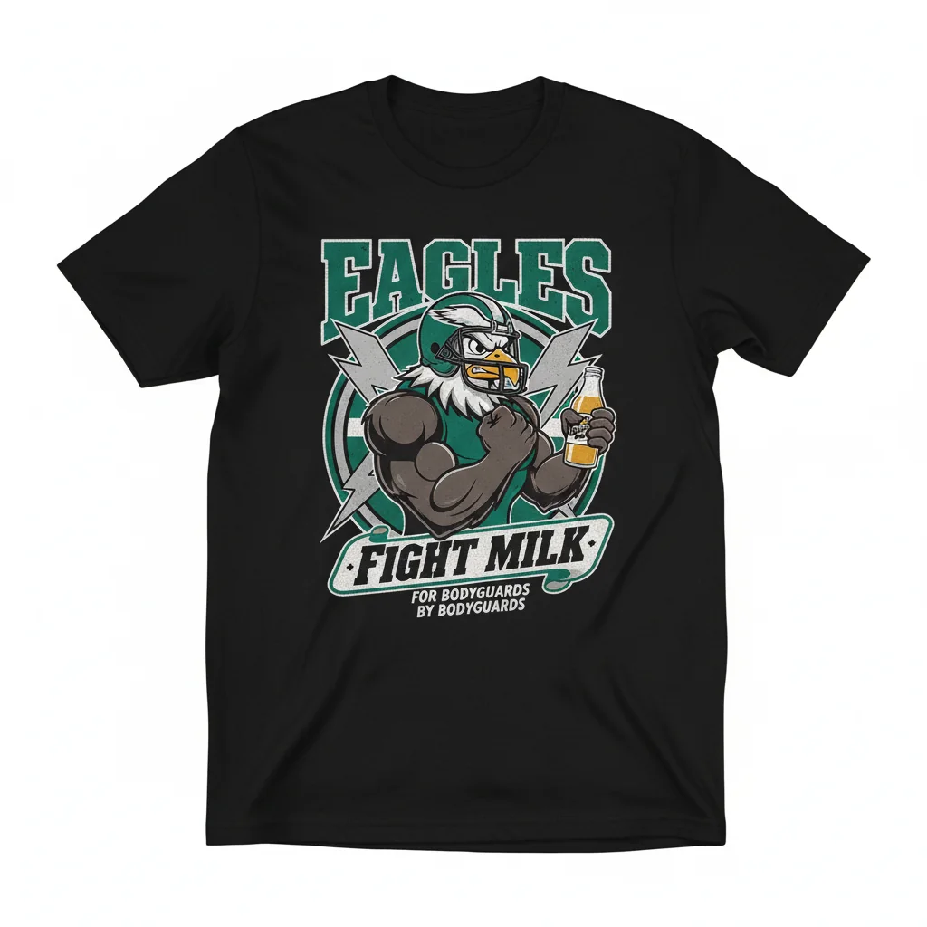 Our design draws directly from the cult classic ‘It’s Always Sunny in Philadelphia,’ blending its unforgettable humor with the powerful symbolism of the Philadelphia Eagles. The ‘Fight Milk for Bodyguards’ concept is reimagined through an artistic lens, creating a visual narrative that’s both clever and deeply resonant for fans of both the show and the team. It’s an homage, a conversation starter, and a vibrant expression of a unique cultural intersection – all thoughtfully crafted into a single, eye-catching design.