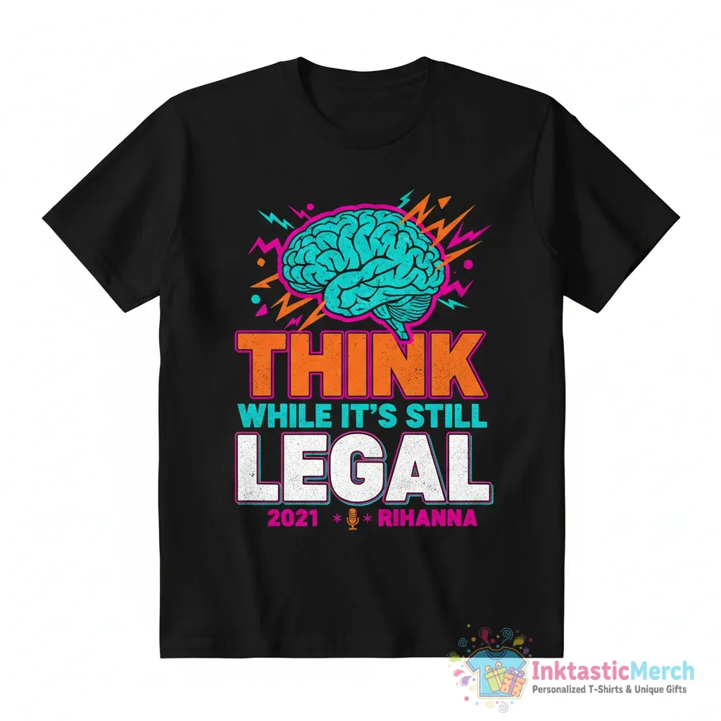 Make a statement with the Think While It’s Still Legal T-shirt. This tee features the bold and thought-provoking slogan “Think while it’s still legal,” inspired by Rîhanna. It’s more than just a shirt; it’s a conversation starter that champions freedom of thought and expression. Crafted from premium materials, this shirt offers both exceptional comfort and lasting durability, making it a standout piece in any wardrobe. The design is printed with high-quality inks to ensure the message stays vibrant wash after wash.