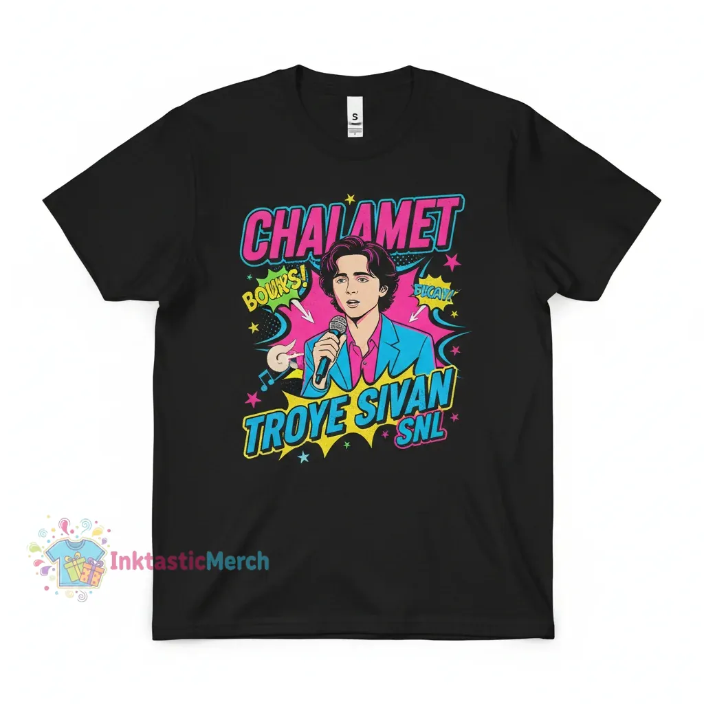 This isn’t just any t-shirt; it’s a statement piece that combines comfort, quality, and your favorite pop culture references. The durable fabric feels great against your skin, making it ideal for all-day wear. The classic unisex fit means it looks good on everyone, offering a relaxed silhouette that’s both fashionable and functional. Imagine rocking this tee at a concert, a casual hangout, or even while binge-watching your favorite shows – it’s designed to fit seamlessly into your lifestyle. Plus, the timeless black color makes it incredibly versatile, easy to pair with jeans, shorts, or anything in between. It’s the perfect way to wear your admiration for Timothee Chalamet and his unforgettable SNL performance.