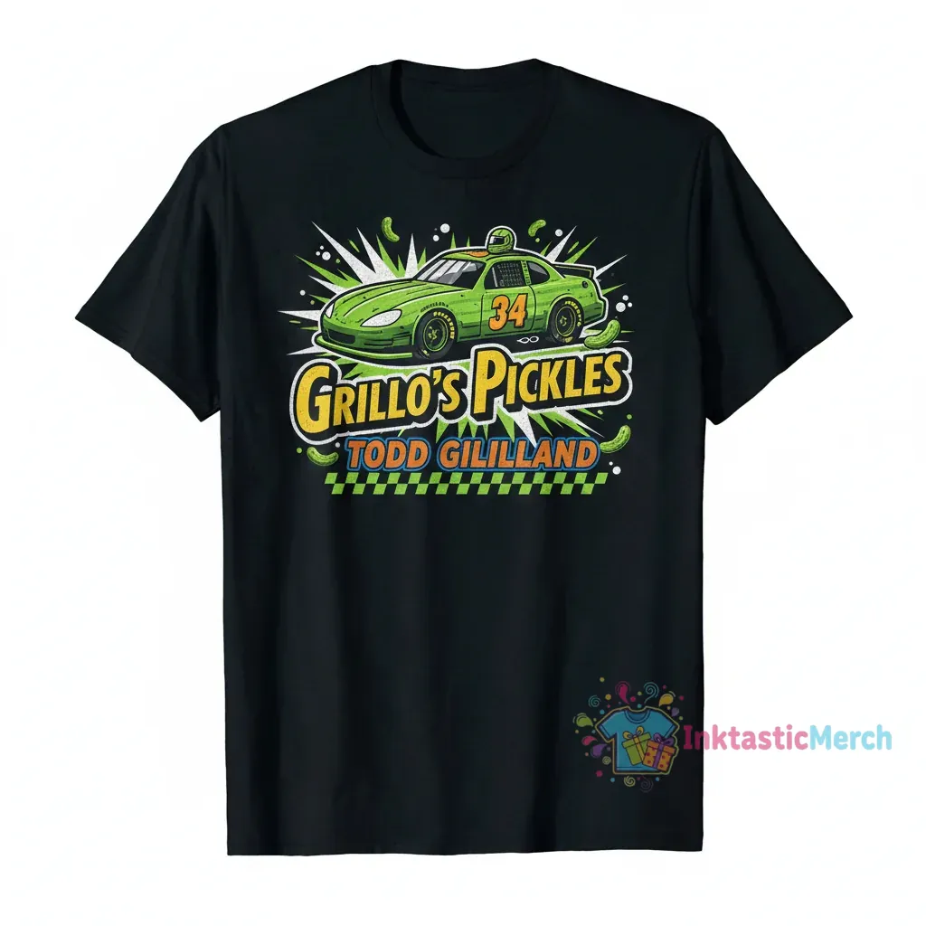 Celebrate the excitement of race day and the fun-loving world of Grillo’s Pickles with the Todd Gilliland Grillo’s Pickles 34 Pickle Car Shirt. Crafted from an exceptionally soft, breathable fabric blend, this shirt offers premium comfort and a relaxed unisex fit, making it a wardrobe essential. Discover unique designs and lasting quality from InktasticMerch.
