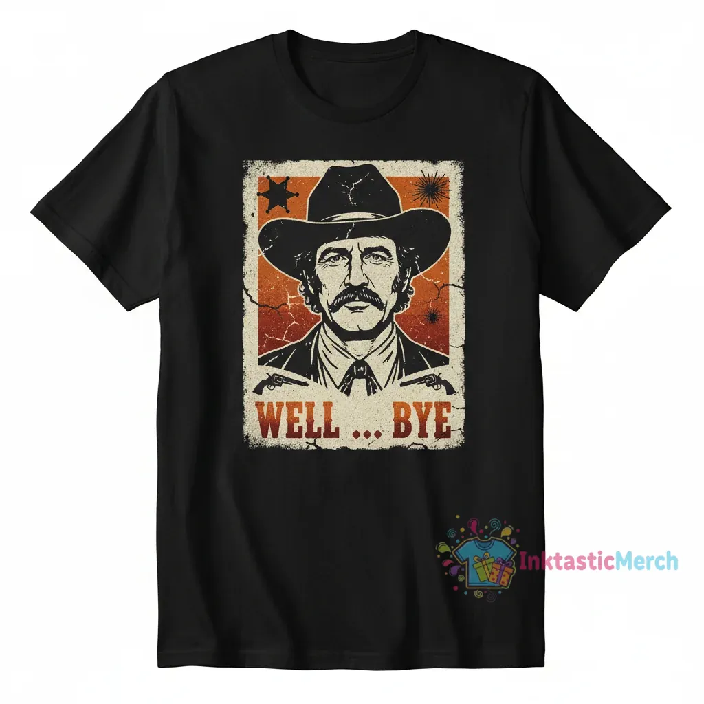 - Unique Tombstone-inspired “Well … Bye” Curly Bill graphic design.