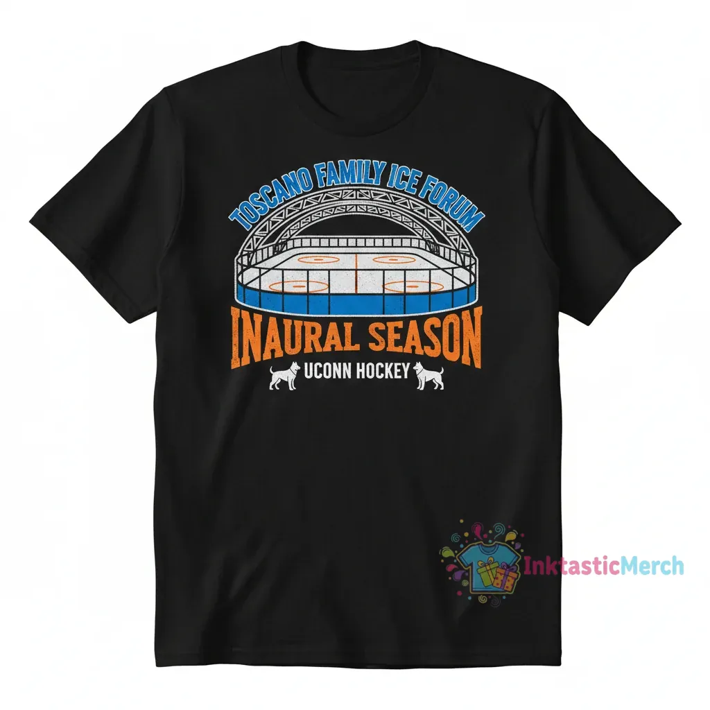 Celebrate the inaugural season of the Toscano Family Ice Forum with this exclusive UConn hockey shirt, a premium t-shirt designed for passionate fans and alumni by <a href="InktasticMerch“>InktasticMerch. Crafted from 100% ring-spun cotton with a modern retail fit and side-seamed construction, this shirt ensures both comfort and durability for game days or everyday wear.