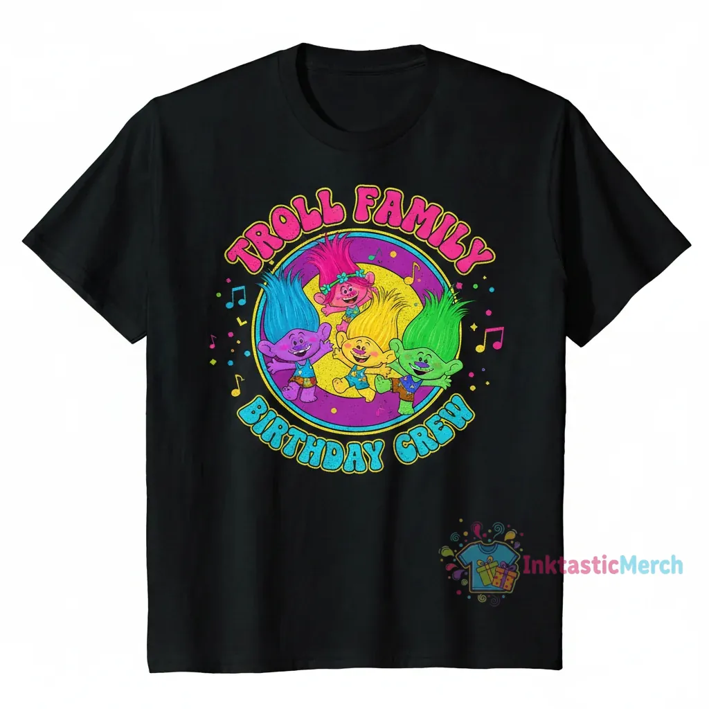 This shirt is perfect for parents planning a Trolls-themed birthday bash, families looking for adorable matching outfits, or any fan who cherishes the vibrant world of Trolls. It’s for those who believe in the power of joy, music, and expressing their personality through fun, character-driven apparel.