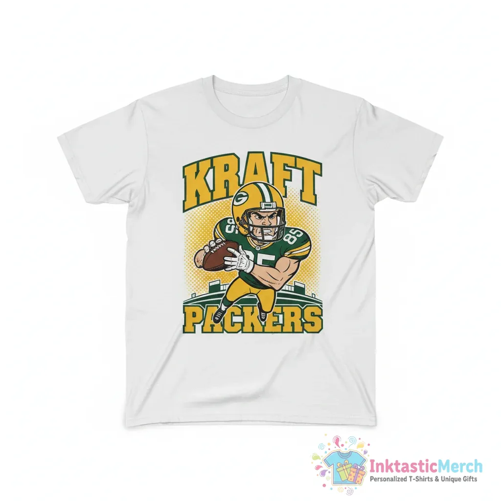 Show your love for the Green Bay Packers and emerging star Tucker Kraft with this fun cartoon-style T-shirt from InktasticMerch. This premium quality tee is designed for both comfort and style, featuring exceptionally soft, premium-quality cotton for all-day comfort and a durable fabric construction designed to last through many seasons. With its unique cartoon graphic and versatile unisex fit, it’s the perfect way to celebrate your team and favorite player in comfort and style.