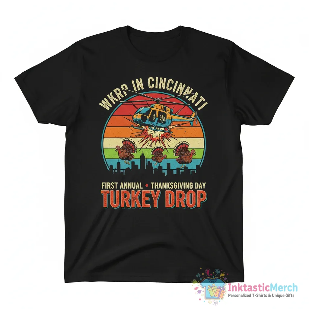 Celebrate Thanksgiving with the exclusive First Annual Turkey Drop WKRP Thanksgiving Day Shirt, a unique tee designed for fans of the classic show and anyone seeking a special holiday outfit. Crafted from ultra-soft, breathable, pre-shrunk cotton, this shirt offers premium comfort and a durable, high-quality feel. Explore more wearable nostalgia from InktasticMerch, designed to be a conversation starter and a comfortable way to show off your holiday cheer.