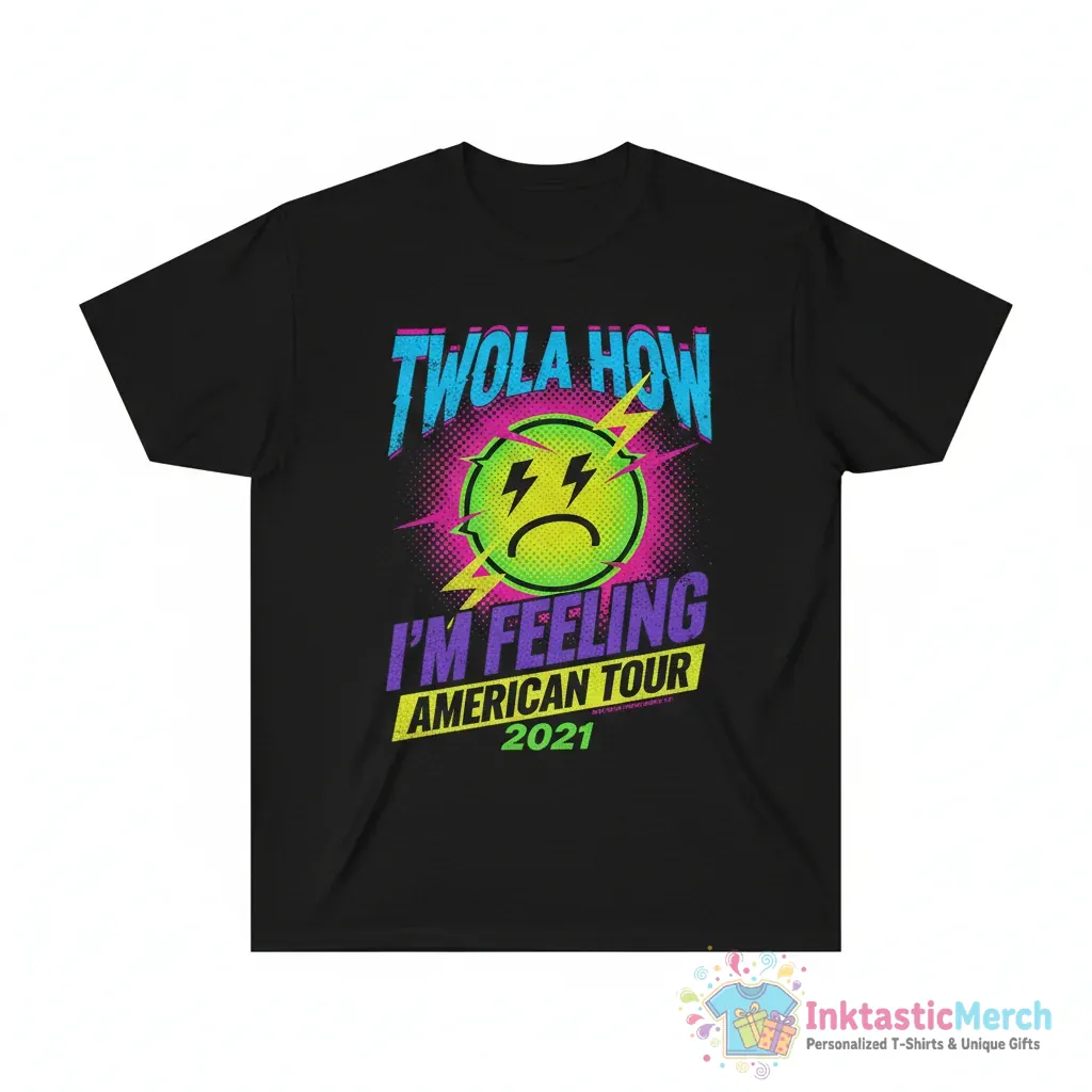Experience ultimate comfort and style with this essential tee. The soft fabric feels great against your skin, making it ideal for all-day wear. The eye-catching Twola How logo design from the 2021 American Tour is printed with high quality, ensuring it stands out and lasts. Its versatile unisex fit is designed for everyone, offering a relaxed and flattering look. Whether you’re heading to a show or just want to represent your favorite tour, this T-shirt blends iconic design with everyday comfort seamlessly.