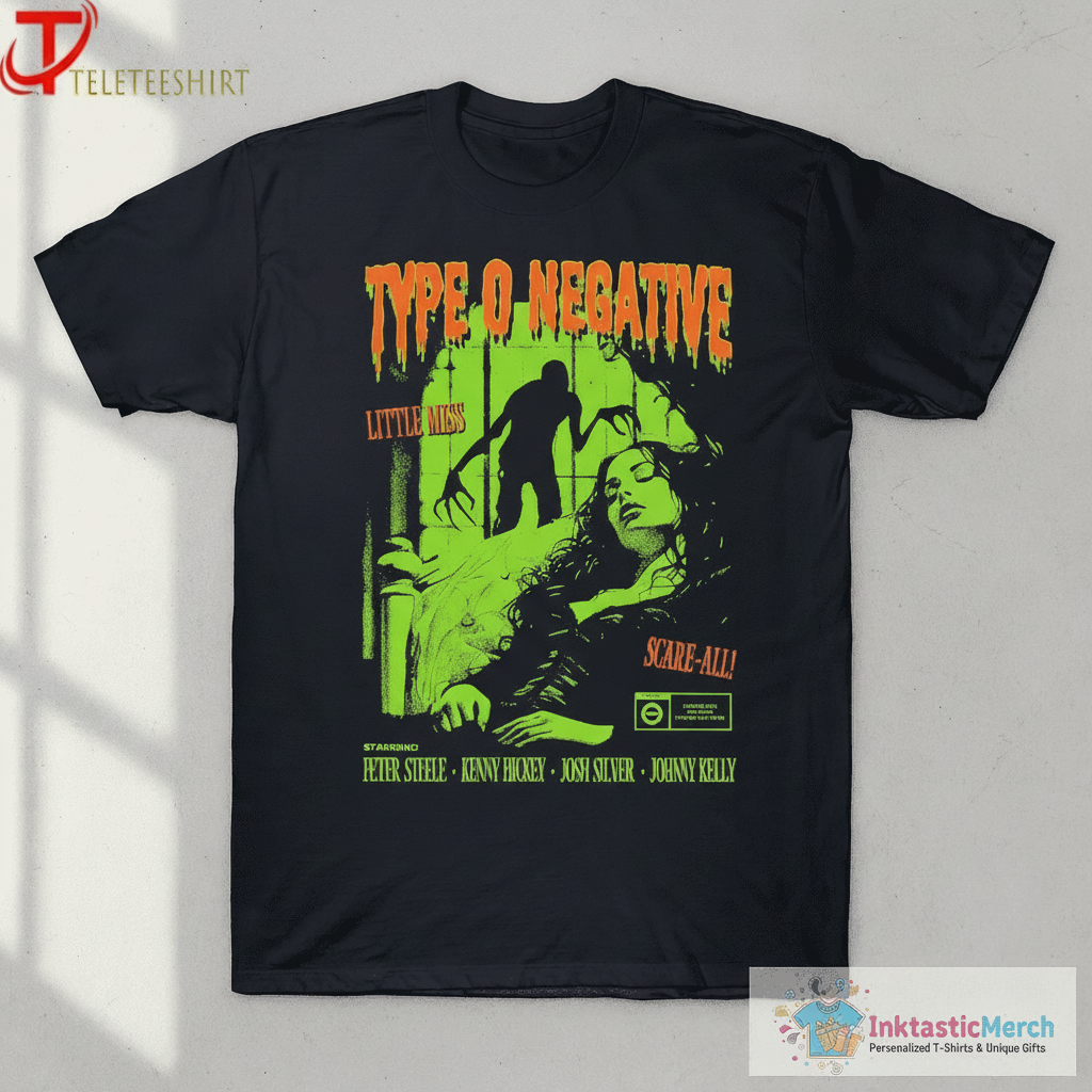 Unleash your inner horror fan with the Type O Negative “Little Miss Scare” T-shirt. This tee celebrates the iconic band, featuring artwork inspired by their unique blend of gothic rock and dark humor. It’s the perfect way to show your love for Peter Steele, Kenny Hickey, Josh Silver, and Johnny Kelly, and all things Type O Negative. Whether you’re a long-time fan or new to their haunting sound, this shirt is a must-have for any music enthusiast who appreciates a bit of spooky style.