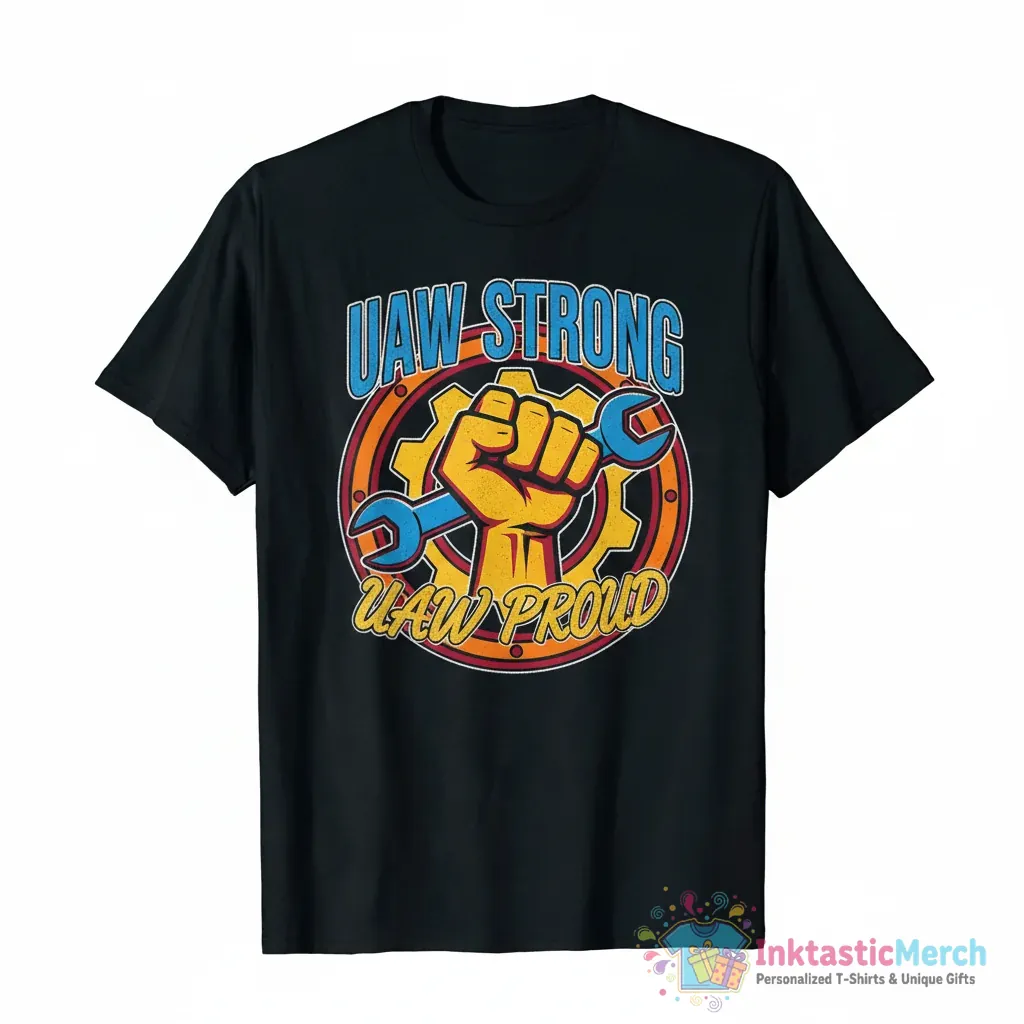 Show your union pride with this UAW strong UAW proud shirt. This tee is more than just apparel; it’s a statement of solidarity and commitment to the United Auto Workers. Crafted for comfort and durability, it’s the perfect way to wear your values. Whether you’re at a rally, on the job, or just out and about, this shirt lets everyone know you stand with the UAW. It’s designed to be a staple in your wardrobe, offering both a powerful message and everyday wearability.